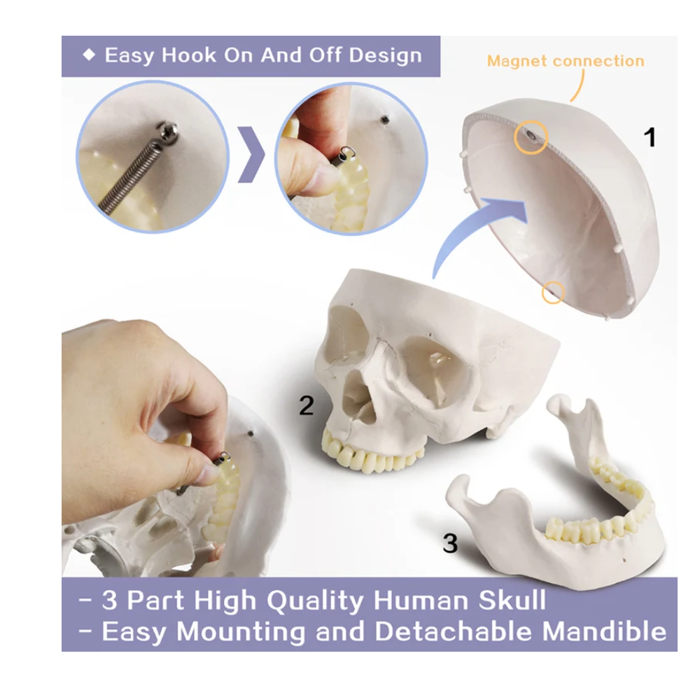 Features: ● Anatomical Skull Model: Includes a highly detailed anatomical model of the human skull. Cast from real adult specimen, you can clearly identify the fissures, parietal, process’s and seams. FEATURES ● Removable Skull Cap & Articulated Mandible: It can be disassembled into 3-part: Calvaria, Base of Skull, and Mandible. A perfect tool for the medical human skull structure learner. With Magnets and Small Pegs, Skull Cap is easily Removable and easy to install. FEATURES ● Medical Quality: The skull model made in non-toxic PVC material, tasteless, easy to clean. Able to be washed and the material will last for years. PERFECT FOR TEACHING & EDUCATION: This skull is just what you were looking for to fill up your bookshelf. This anatomical replica is perfect for anyone in education or medical field. FEATURES ● Come with Thoughtful Gift: Includes a free colorful human skull chart to show all the detailed structures for reference and 12 Month professional and friendly After-sales service ensures long-lasting enjoyment of your purchase. Dimensions: Measures: 8.27 x 8.11 x 5.94 inches Weight: 2.2 Pounds