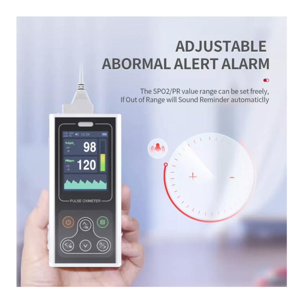 Programmable audio-visual alarms for SpO2 and pulse rate limits – ensuring timely response in critical situations.