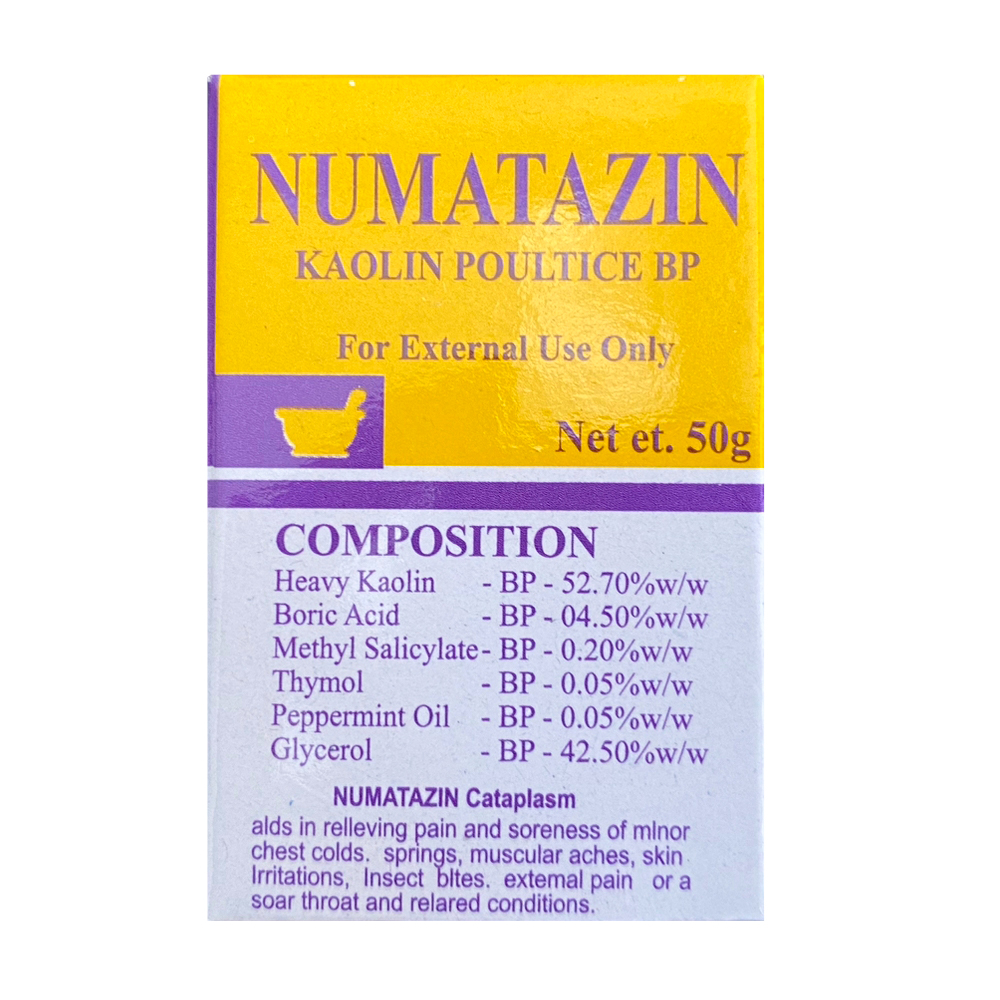 Details 50g, 500g ads in relieving pain and soreness of minor chest colds. Springs, muscular aches, skin irritations, insect bites, external pains or sour throat and related conditions.   Numatazin: Advanced Solution for Effective Wound Care and Infection Prevention